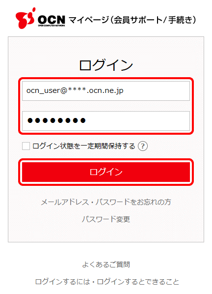 [ログイン]画面が表示されます。 [メールアドレス(OCN ID)]、[メールパスワード(OCN IDパスワード)]を入力し、[ログイン]をクリックします。